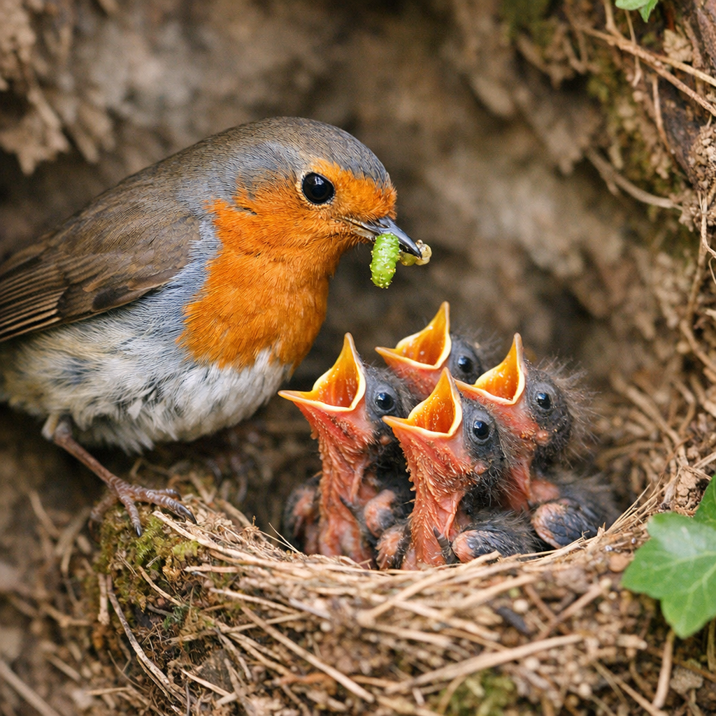 Le rouge-gorge est solitaire. Il fuit la compagnie, sauf au printemps lorsqu’il se met en quête d’un conjoint ou d’une conjointe. Lorsque le couple se forme, Madame Rouge-Gorge se met à construire un nid en utilisant des herbes, de la mousse et des feuilles. Souvent posé au sol et adossé à un talus ou une haie, le nid est équipé d’une couverture. Il abrite généralement deux pontes de 5 à 6 œufs par an, en avril et en juin. La femelle couve durant 13 ou 14 jours. A l’éclosion, les oisillons, 2 g chacun, sont nourris par les deux parents.
