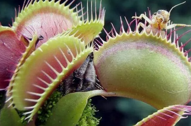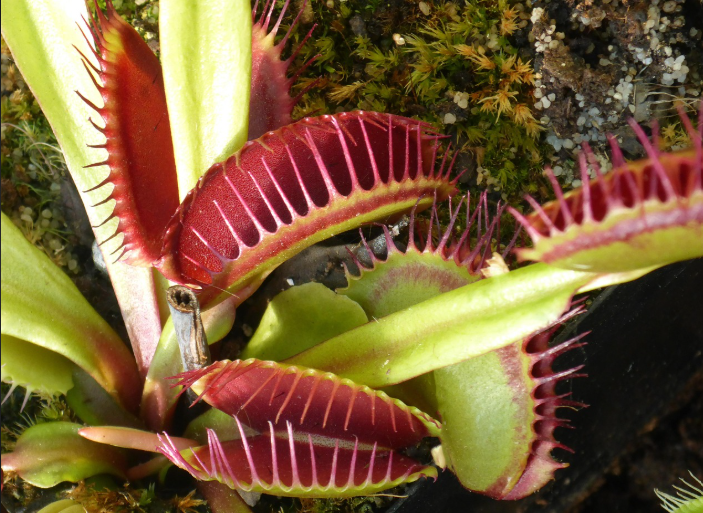 Les dionées sont les plus connues des plantes carnivores. Originaires des marais de Caroline du Nord et du Sud aux Etats-Unis d’Amérique, elles sont équipées d’un piège à mâchoires. Chaque feuille est constituée de deux lobes arrondis et charnus tapissés en leur centre de petits poils. Lorsqu’ils sont sollicités par le passage d’un insecte, les deux lobes se referment instantanément comme le ferait un piège à loups. Chaque lobe est doté de dents qui s’imbriquent les unes dans les autres au moment de la fermeture, empêchant la proie de s’enfuir. Une fois fermé, le piège se resserre afin de mettre l’insecte en contact avec les glandes digestives situées sur la face interne du lobe. Le repas terminé, le piège se rouvre et laisse apparaître la carapace de la victime car la plante n’absorbe que les parties molles de ses proies.