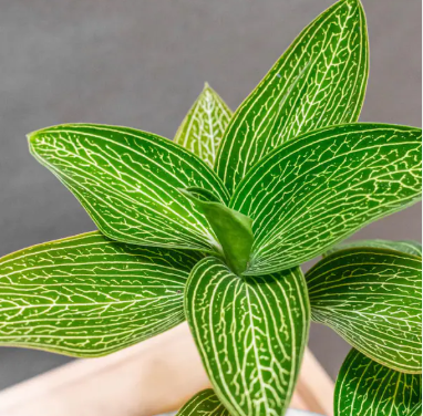 En intérieur, on peut tabler sur l’orchidée « bijou » dont le feuillage vert foncé strié de rouge est très doux. Elle donne des fleurs en épis blancs.